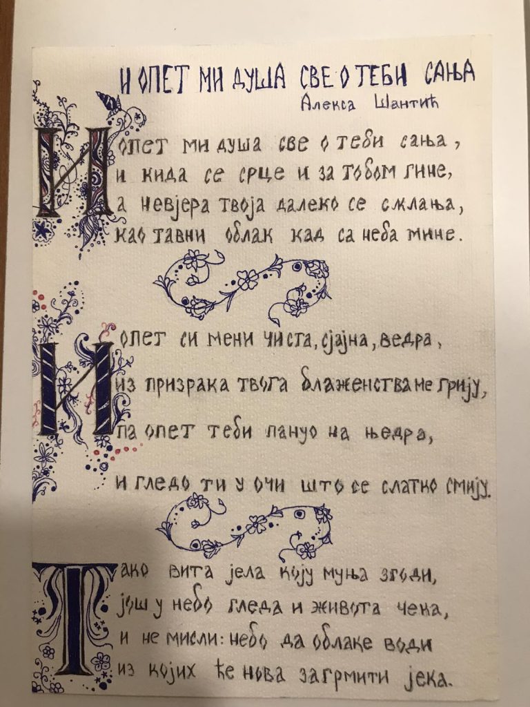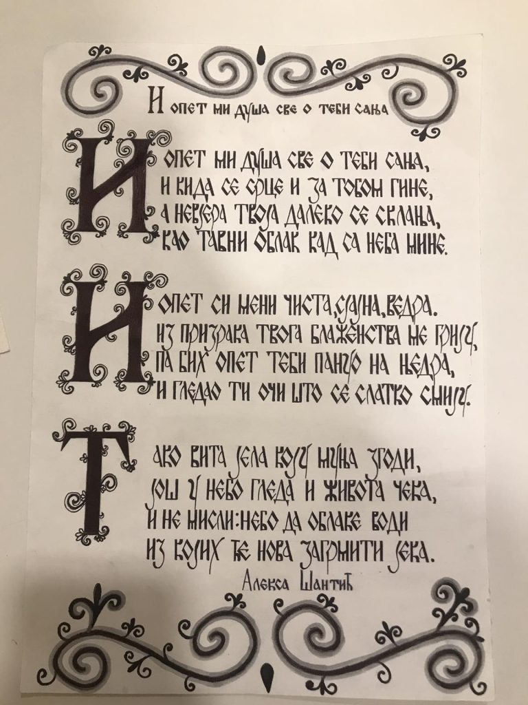 Катарина Благојевић и Катарина Тошић су калиграфским рукописом, посвећено, написале стихове Шантићеве пјесме ,,И опет ми душа све о теби сања“ јер поезија је врхунац изражајности језика, а ћирилица најсавршеније писмо.