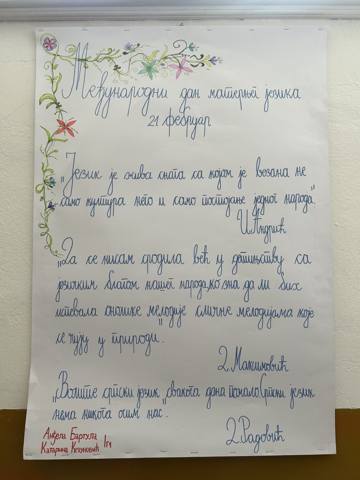 Поводом Међународног дана матерњег језика, 21. фебруара, гимназијалке Анђела Бартула и Катарина Кезуновић израдиле су пано исписан најљепшим ћириличким рукописом.